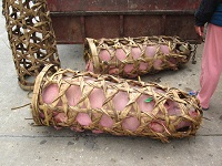 Rupanya sang tuan dan karyawannya sdang memaksa babi masuk ke dalam keranjang babi yang panjang. Keranjang berisi babi itu kemudian dinaikkan ke dalam kereta kuda.