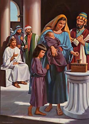 Pada suatu kali Tuhan Yesus dengan sengaja duduk menghadap peti persembahan di Bait Allah untuk memperhatikan bagaimana orang banyak memasukkan uang ke dalamnya. Banyak orang kaya memberi dalam jumlah yang besar. Lalu datanglah seorang janda yang miskin dan ia memasukkan dua peser, yaitu uang receh yang terkecil nilainya.